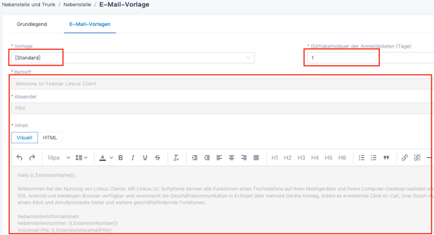 Die Linkus Willkommens-E-Mail wird verwendet, um dir deine Nebenstellennummer und Voicemail-PIN sowie die Anmeldedaten und Anweisungen für die Linkus UC-Clients bereitzustellen. Die Pier4Voice stellt eine Standard-E-Mail-Vorlage zur Verfügung, du kannst aber auch deine eigene Vorlage anpassen.