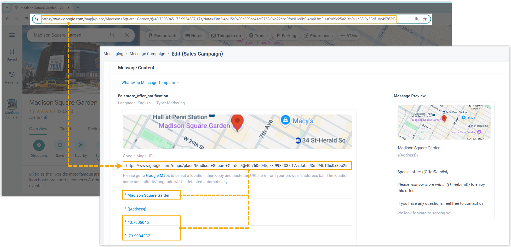 - Für Standortinformationen können Sie einfach die Google Maps -URL einfügen. Das System füllt dann automatisch Name und Koordinaten anhand der URL aus. Die detaillierte Adresse für die