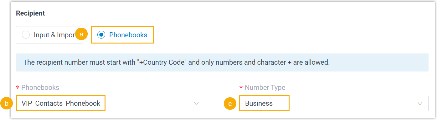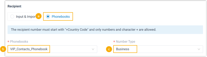 - Absender : Wählen Sie die Nummer aus, die dem ausgewählten SMS-Kanal für den Nachrichtenversand zugeordnet ist.