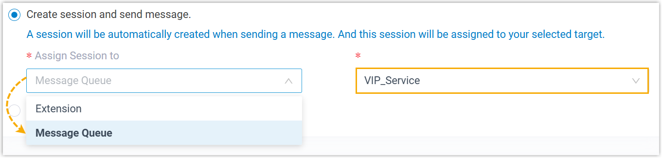 Option Beschreibung Sitzung erstellen und Nachricht senden Das System erstellt beim Versenden der Kampagnennachrichten automatisch für jede Kontaktnummer eine Sitzung, und die Sitzungen werden einem ausgewählten Ziel (entweder einer Nebenstelle oder einer Nachrichtenwarteschlange) zugewiesen. Hinweis:Falls für eine Kontaktnummer bereits eine aktive Sitzung existiert, wird die Kampagnennachricht an die bestehende Sitzung gesendet, anstatt eine neue Sitzung zu erstellen und dem angegebenen Ziel zuzuweisen.Senden Sie Nachrichten direkt, ohne eine Sitzung zu erstellen. Beim Senden einer Nachricht wird keine Sitzung erstellt. Die Nachricht wird auch nicht in den externen Chatprotokollen angezeigt .