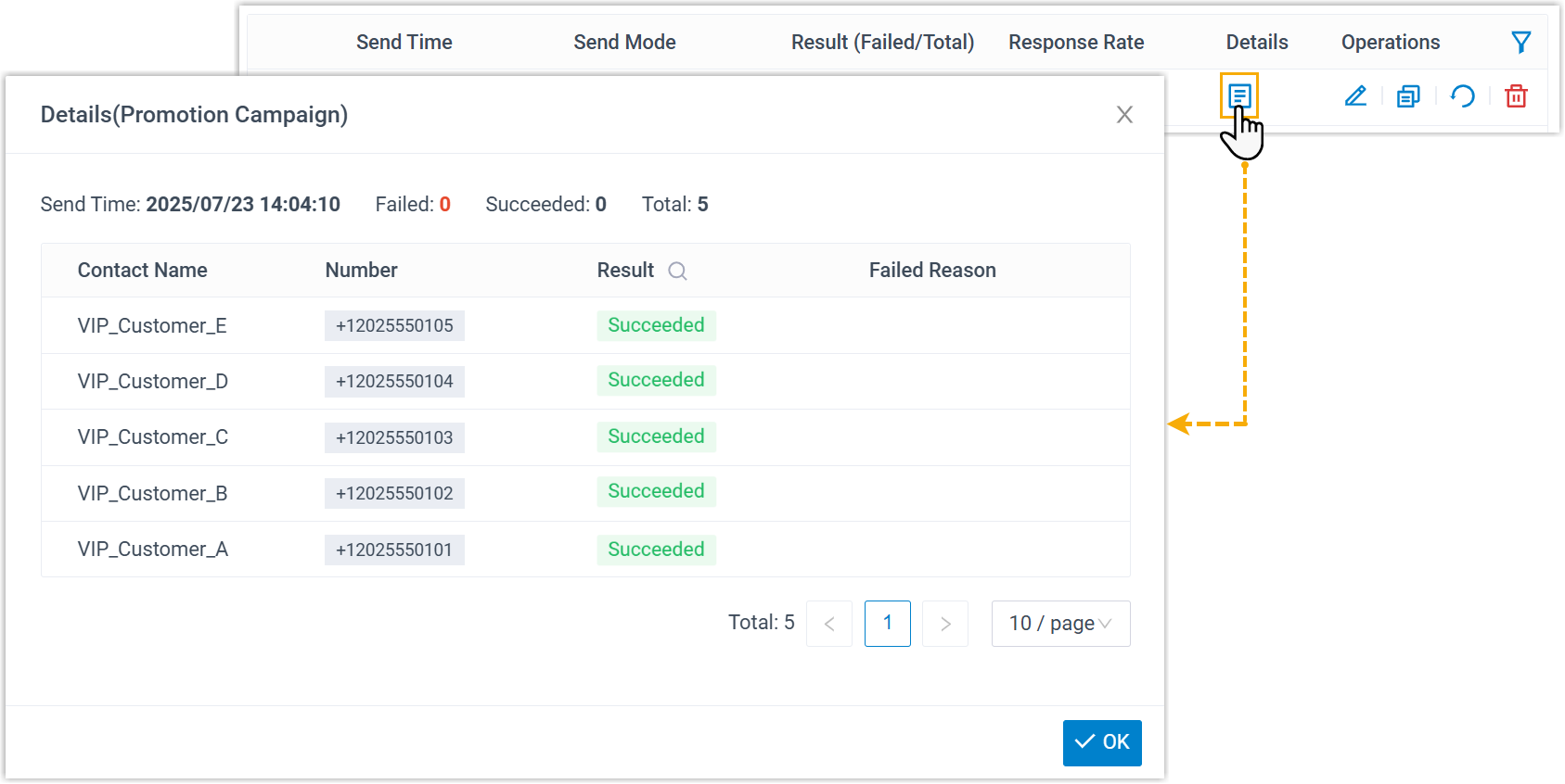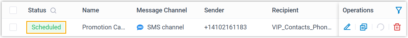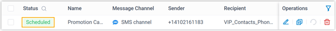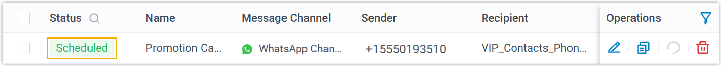 - Wenn Sie die Kampagne terminiert haben, wird der Kampagnenstatus als „Geplant“ angezeigt , und die Nachrichten werden automatisch zum angegebenen Zeitpunkt versendet.