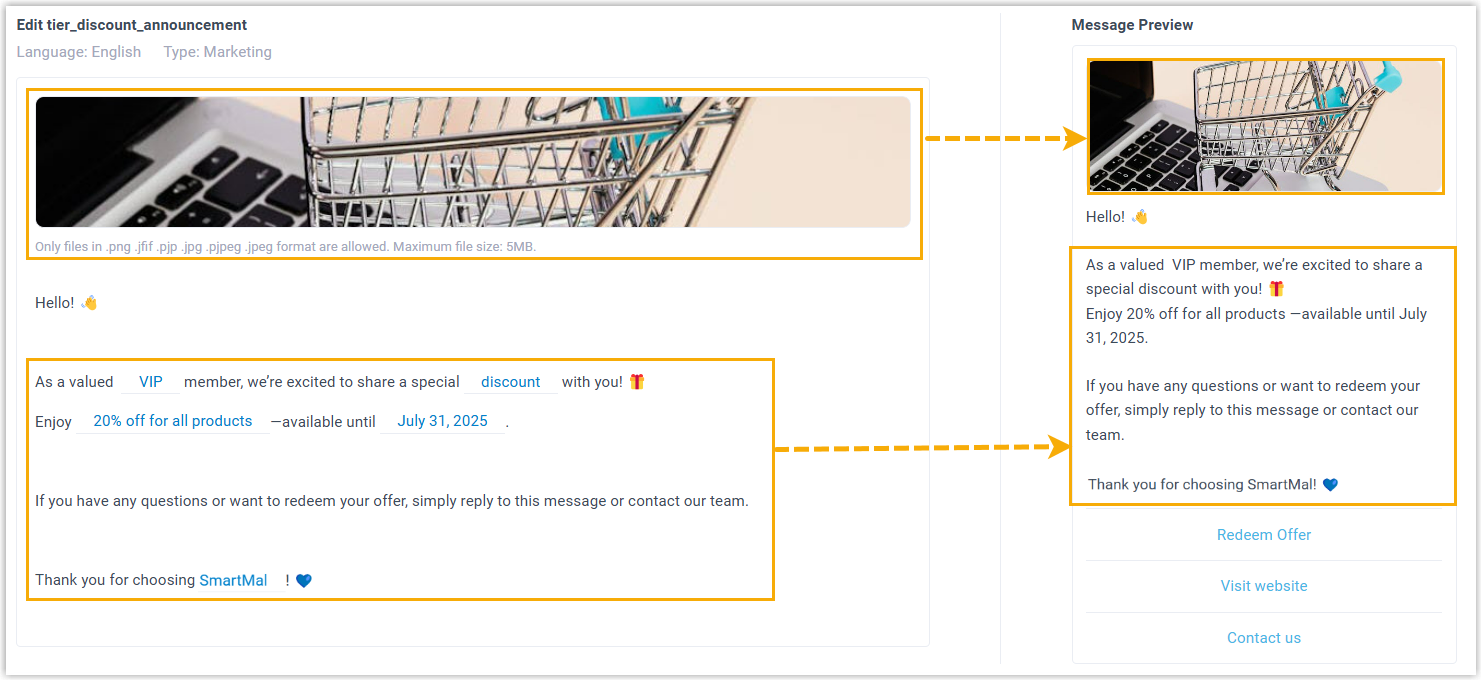 - Im Abschnitt „Nachrichteninhalt“ konfigurieren Sie die zu sendende Nachrichtenvorlage.