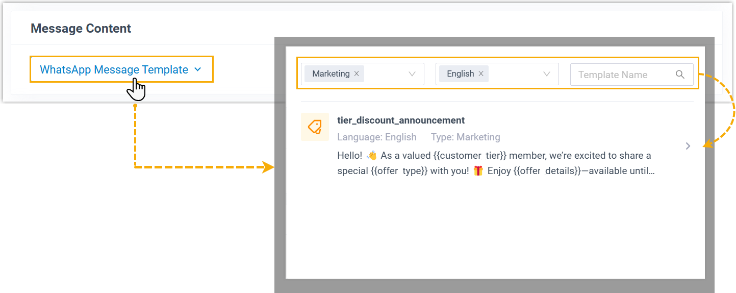 - Klicken Sie auf WhatsApp-Nachrichtenvorlage , suchen Sie dann nach der gewünschten Nachrichtenvorlage und wählen Sie diese aus.