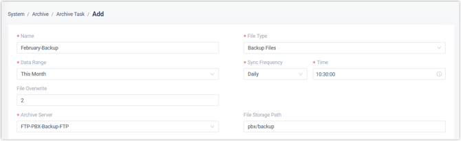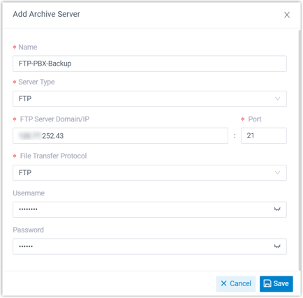 Archivserver Wählen Sie den hinzugefügten FTP-Server aus . Ordner/Pfad auswählen Optional. Geben Sie den Pfad zu dem Ordner an, in dem Sie archivierte Dateien speichern möchten. Zum Beispiel: pbx/backup/.Notiz:Wenn Sie dieses Feld leer lassen, werden die Dateien im Stammverzeichnis gespeichert.Archivierte Dateien überspringen Optional. Geben Sie an, ob bereits archivierte Dateien übersprungen werden sollen. Notiz:Diese Option ist nur verfügbar, wenn Sie die Archivierung von Aufnahmedateien planen.- Wenn diese Option aktiviert ist, werden bereits archivierte Dateien nicht archiviert.