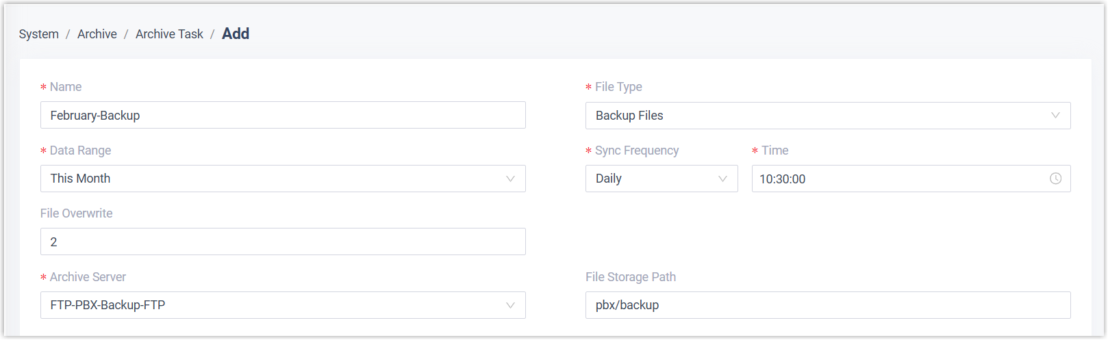 Einstellung Beschreibung Name Geben Sie einen Namen ein, damit Sie die Aufgabe leichter identifizieren können. Dateityp Wählen Sie je nach Bedarf Aufnahmedateien oder Sicherungsdateien aus . Datenbereich Geben Sie einen Zeitraum für die Archivierung der Dateien an. Notiz:Sie können Dateien jeweils bis zu 31 Tage lang archivieren.Synchronisationsfrequenz Legen Sie fest, wie oft Dateien auf dem FTP-Server archiviert werden sollen. Notiz:Da große Datenmengen die CPU-Ressourcen der Telefonanlage stark beanspruchen, empfehlen wir Ihnen, Archivierungsaufgaben außerhalb der Spitzenzeiten zu planen.- Einmal : Wenn Sie diese Option wählen, archiviert das System die Dateien sofort nach dem Speichern des Auftrags.