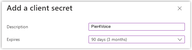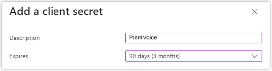 Geben Sie auf der Seite Client-Geheimnis hinzufügen eine Beschreibung ein und legen Sie ein Ablaufdatum für das Client-Geheimnis fest. Klicken Sie dann auf Hinzufügen.
