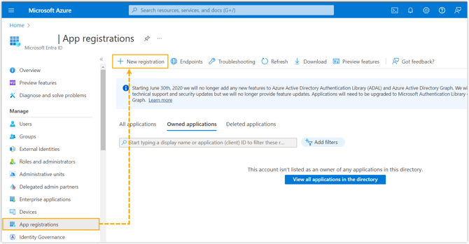 Gehen Sie in der linken Navigationsleiste des Organisationsverzeichnisses zu App-Registrierungen und klicken Sie auf Neue Registrierung.