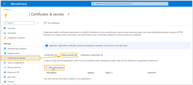 Gehen Sie in der linken Navigationsleiste der Anwendung zu Zertifikate & Geheimnisse > Client-Geheimnisse und klicken Sie auf Neues Client-Geheimnis.