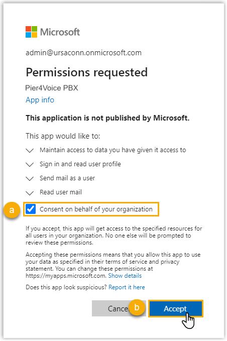 Aktivieren Sie das Kontrollkästchen Zustimmung im Namen Ihrer Organisation.